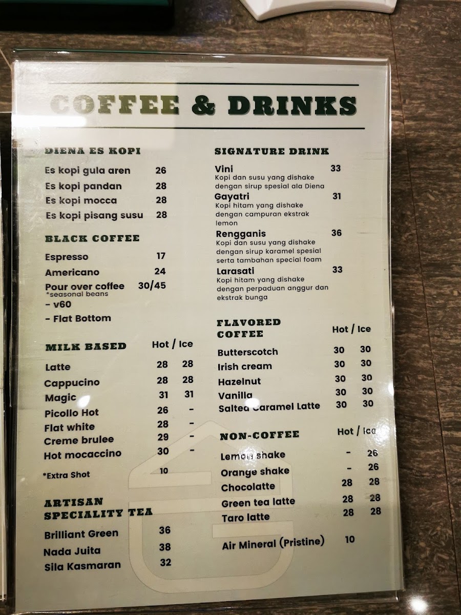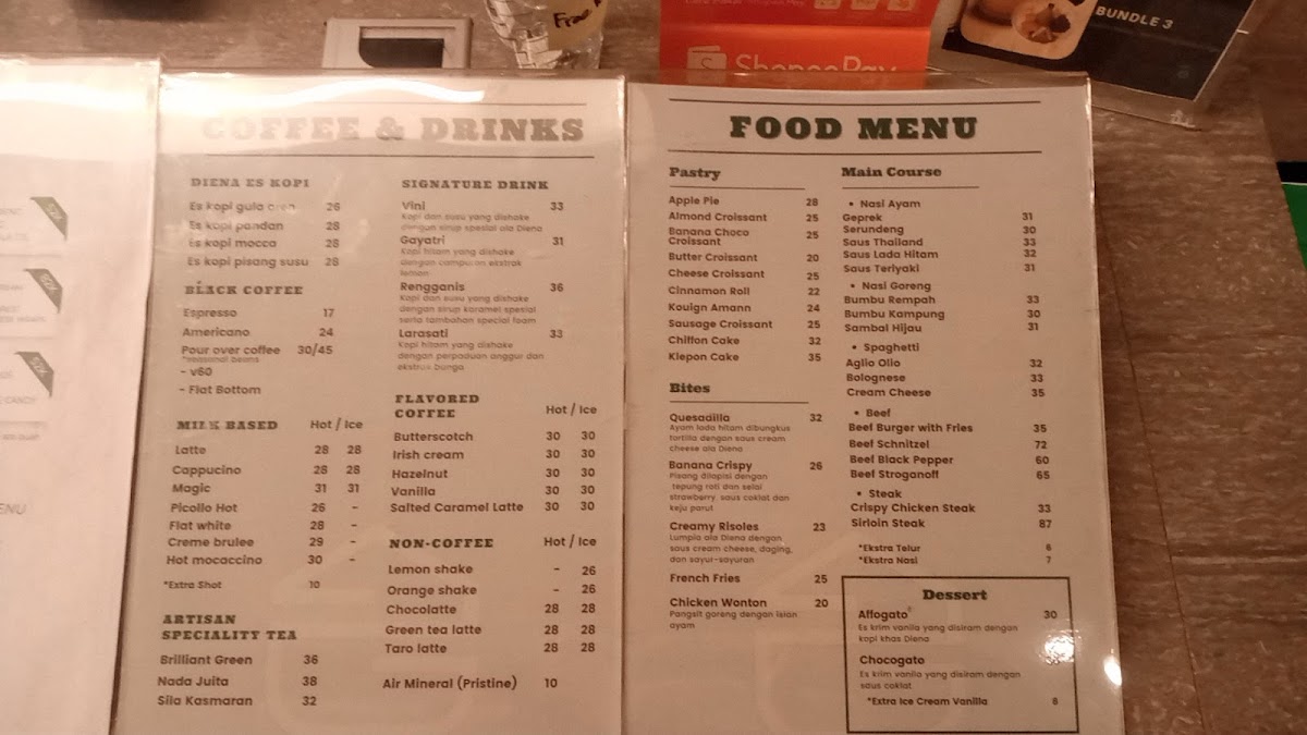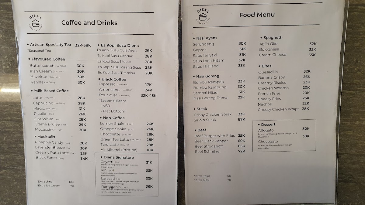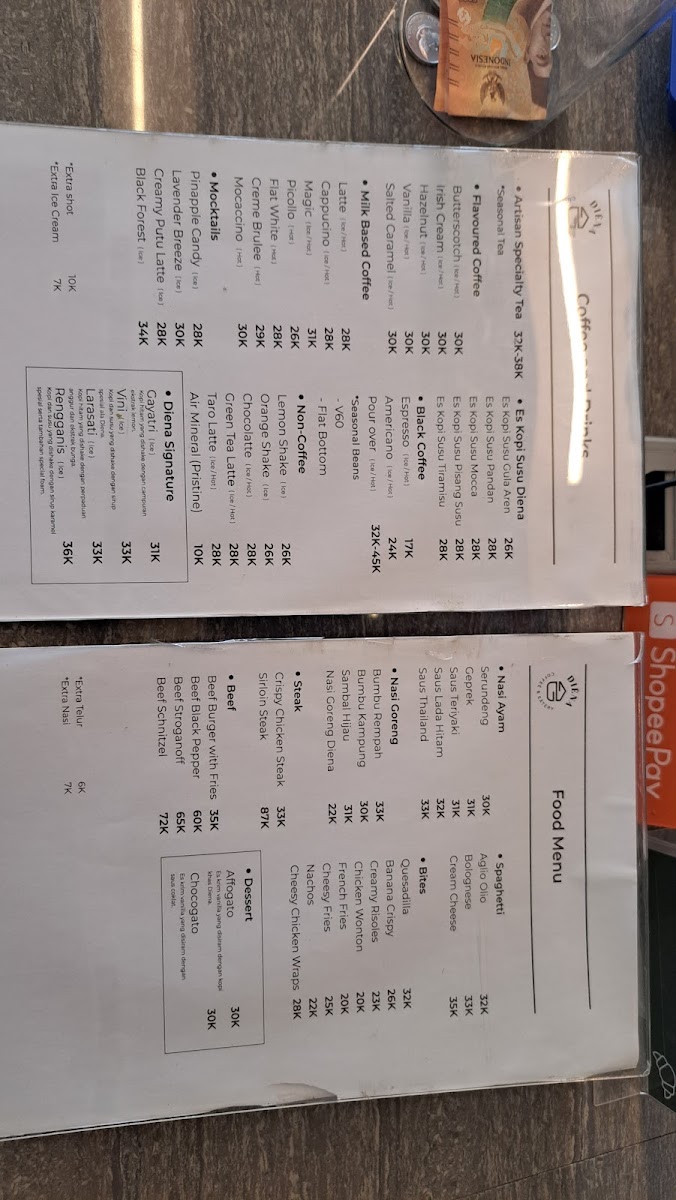 Welcome to Diena Coffee and Eatery, a hidden gem nestled in Perum Puri Kanaya, Depok. This charming coffee shop is perfect for both casual diners and remote workers, offering a cozy atmosphere that invites you to stay awhile. Renowned for its delectable dishes, the menu features standout items like their scrumptious quesadillas, which have earned rave reviews from patrons. Alongside a diverse selection of expertly brewed coffees, Diena caters to all taste buds. The ambiance, enhanced by warm decor, makes it a favored spot for rainy evenings, encouraging leisurely conversations and productive work sessions. Customers appreciate the balance of quality and affordability, describing the service as exceptional. Whether you’re catching up with friends or need a quiet place to concentrate, Diena Coffee and Eatery delivers an experience that feels like a delightful home away from home.